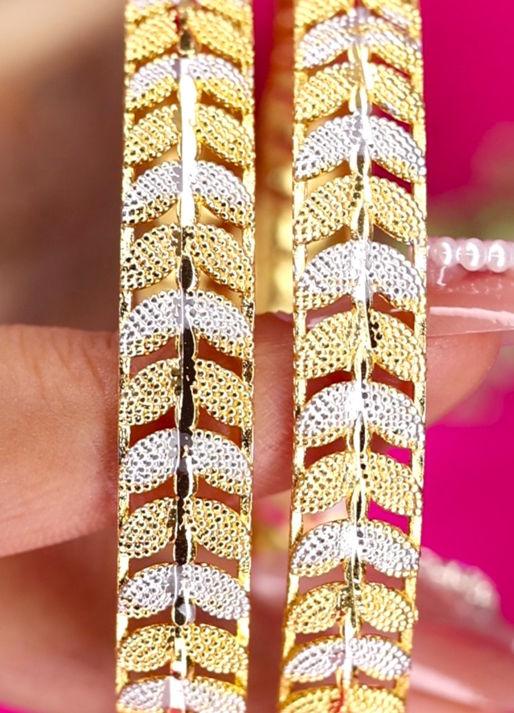 Elevate your ethnic charm with this elegant set of two handcrafted bangles. Featuring an intricate design and finished with luxurious 18K gold plating, these bangles are the perfect blend of cultural heritage and contemporary style.